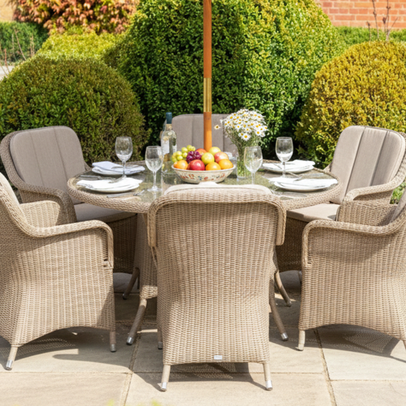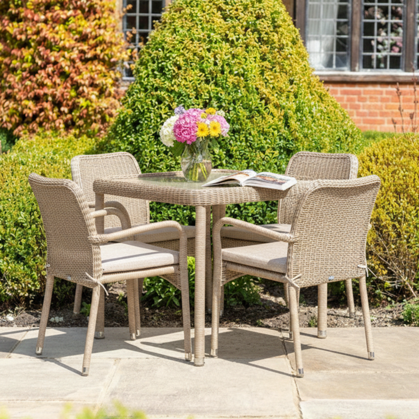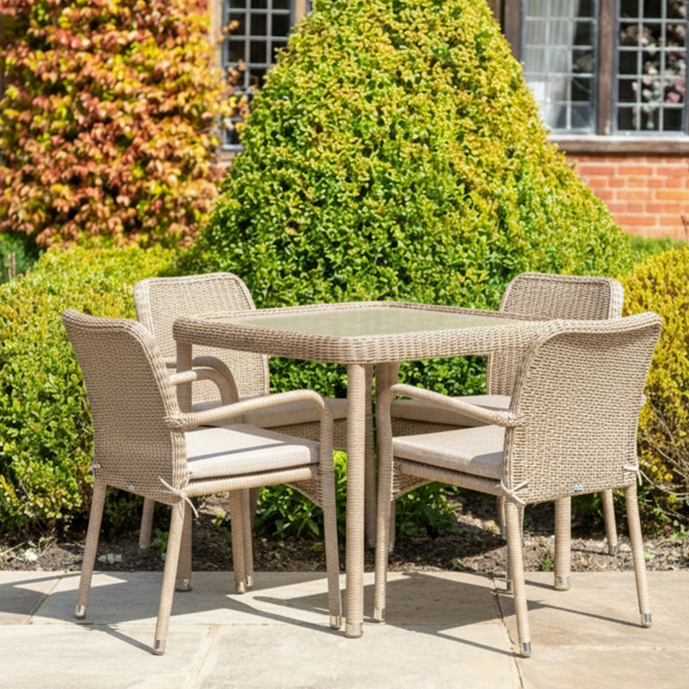 In our outdoor dining collection we have a choice of nearly a hundred different styles of tables and chairs from which to choose. Within this comprehensive range of outdoor dining furniture, there is a choice of different materials from woods and metals, to weaves and rattans. Prices vary across the collections dependent upon sizes, styles and materials. If you can't find what you are looking for, please get in touch as our customer services team will be able to give you more guidance.