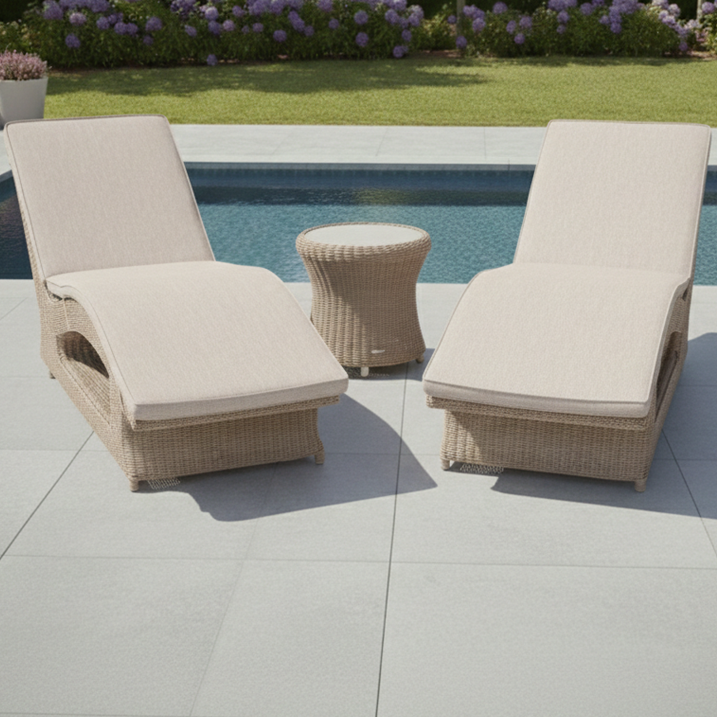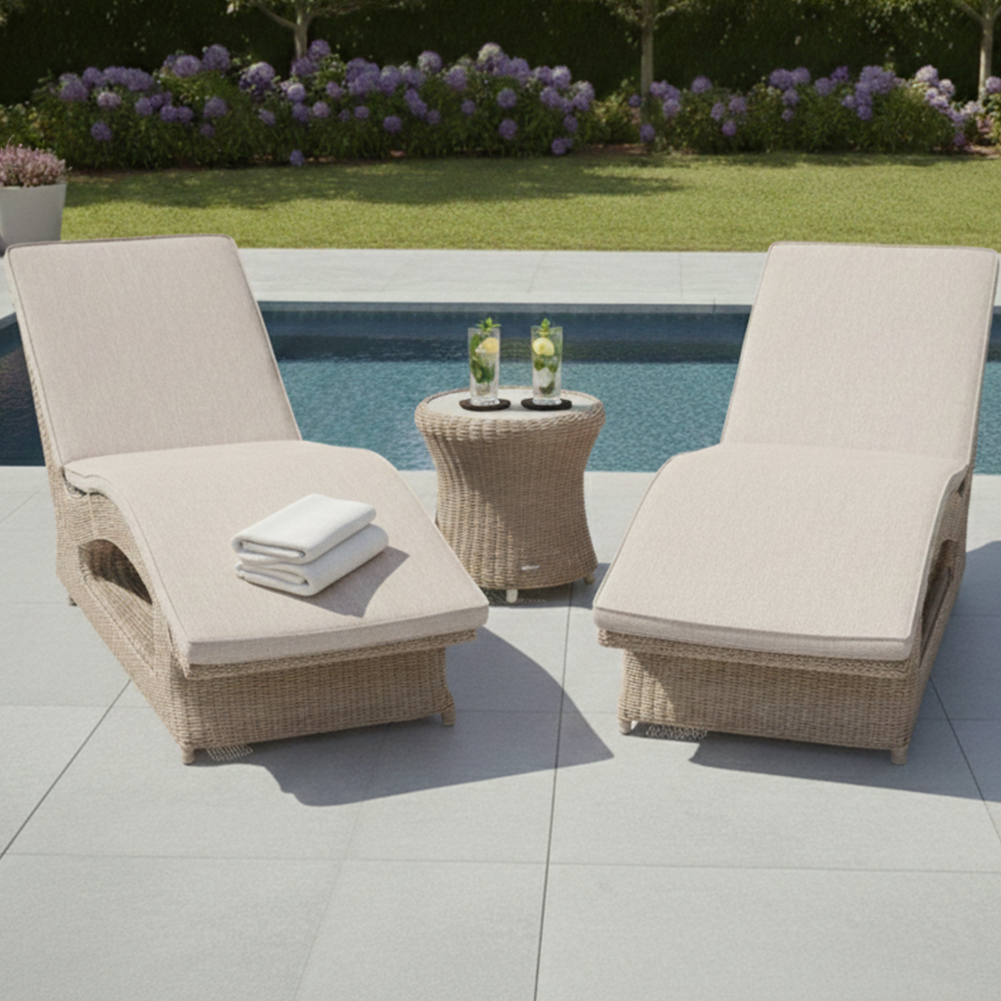 Whether unwinding by the pool or enjoying a good book, the Hazelmere Fixed Sunbed offers the perfect spot to relax in comfort and style. Hand-woven in Natural or Grey, it pairs effortlessly with our side table, providing a convenient place to rest your drink while enhancing your outdoor space with timeless elegance.